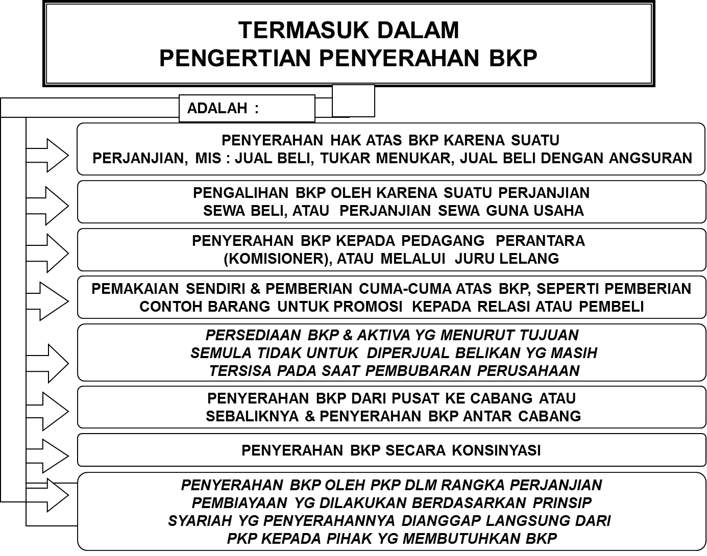 - penyerahan Barang Kena Pajak oleh Pengusaha Kena Pajak dalam rangka perjanjian pembiayaan yang dilakukan berdasarkan prinsip syariah, yang penyerahannya dianggap langsung dari Pengusaha Kena Pajak kepada pihak yang membutuhkan Barang Kena Pajak.